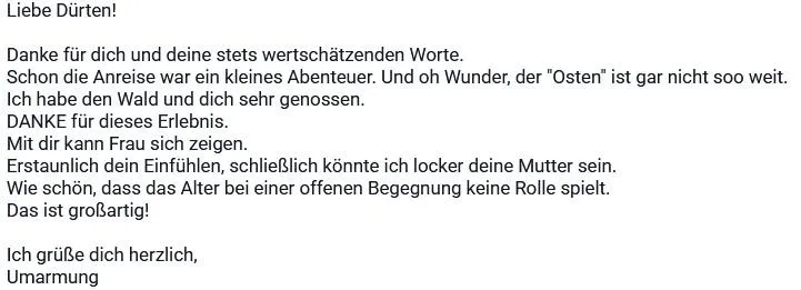 Ganz und gar nicht! Ich auch ;-).Du darfst so sein, wie du bist. Es gibt keinen Zwang zu reden oder dich zu öffnen. Du kannst einfach nur da sein, lauschen und genießen. Alles ist möglich.